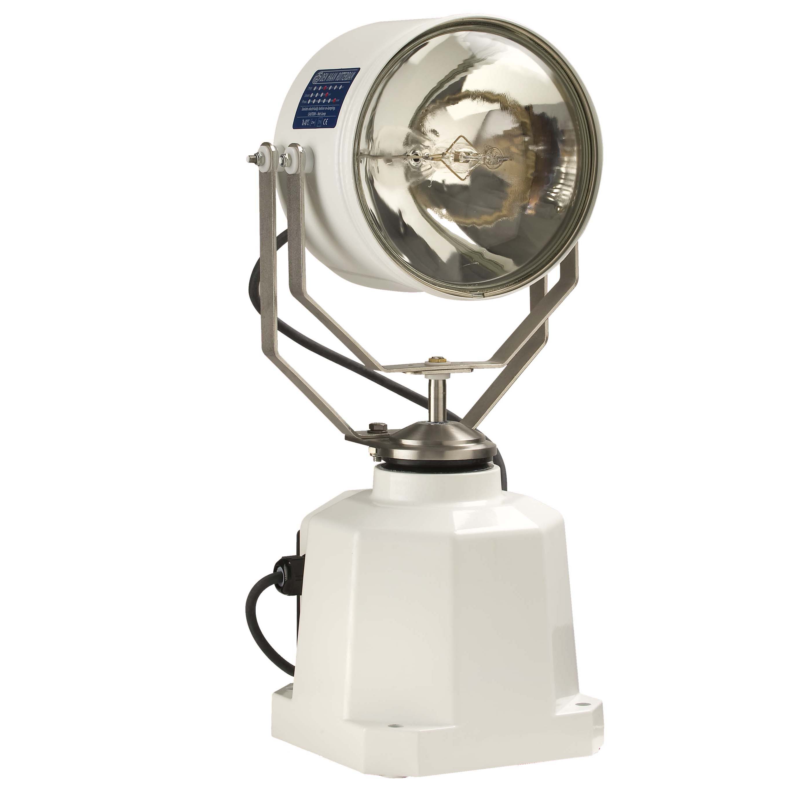 DHR210 søkelyshuset er laget av sjødyktig, kromatert aluminium med en hvit pulverlakkert finish. Den har en forseglet strålelampe PAR64 med en rekkevidde mellom 630 og 700 meter. 24VDC -250Watt-versjonen har middels stråle og 115/230VAC-1000Watt bred stråle. Fordelen med en forseglet strålelampe sammenlignet med en vanlig pære er at når du skifter lampen, fornyer du også optikken. Gir deg alltid den optimale strålevinkelen og lysintensiteten.