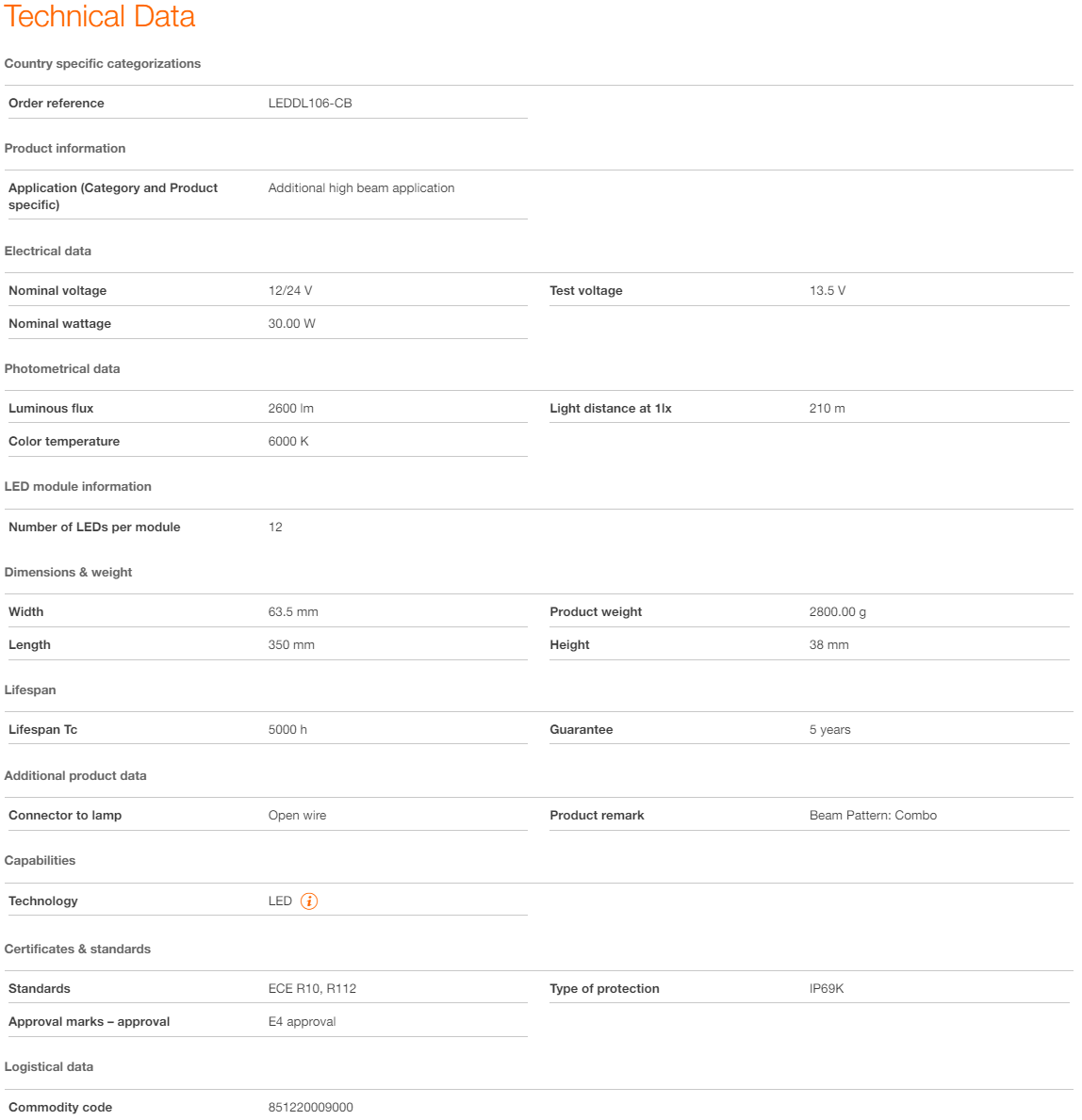 Enten på vei eller på vei – OSRAM LEDriving Lightbar SX300-CB imponerer med sin kraftige ytelse og lange levetid med opptil 5000 timer. Allsidig anvendelig, den trosser mange miljøpåvirkninger, og takket være materialer av høy kvalitet som aluminiumshuset og den stabile polykarbonatlinsen, er den spesielt lett og samtidig robust og motstandsdyktig. OSRAM LEDriving Lightbar SX300-CB er testet og validert med IP-beskyttelsesklasse IP69K i vårt DIN-sertifiserte miljøsimuleringslaboratorium for ekstreme ytre påvirkninger angående vann, støv, støt, varme, kulde og permanent vibrasjon. Den integrerte driveren og det termiske styringssystemet regulerer temperaturen på LED-lysstangen og kan dermed forhindre skader fra overoppheting. Polaritetsbeskyttelsen hemmer feil polaritet i spenningsforsyningen og kan dermed forhindre mulig skade ved automatisk å slå av lysdiodene. På vei og offroad er OSRAM LEDriving Lightbar SX300-CB et effektivt og effektivt tillegg til bilen din. Ingen registrering eller oppføring i kjøretøydokumentene er nødvendig for disse ECE-sertifiserte LED-kjørelysene2).
